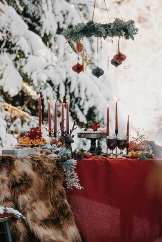 Pine, cedar, or eucalyptus branches add lodge character without overwhelming a small footprint.